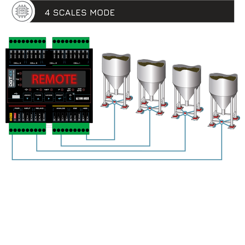 DGT4X | High speed weight transmitter for DIN bar with 4 channels, 2 IN and 2 OUT. 5-key keypad, LED display. | |